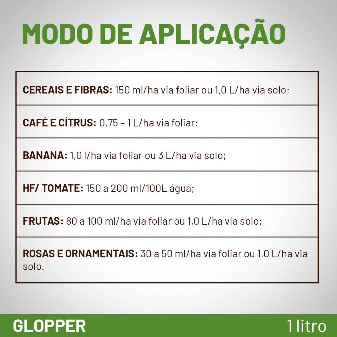 - Cereais e Fibras: Aplique 500 a 700 ml por hectare via foliar ou 1,0 litro por hectare via solo.