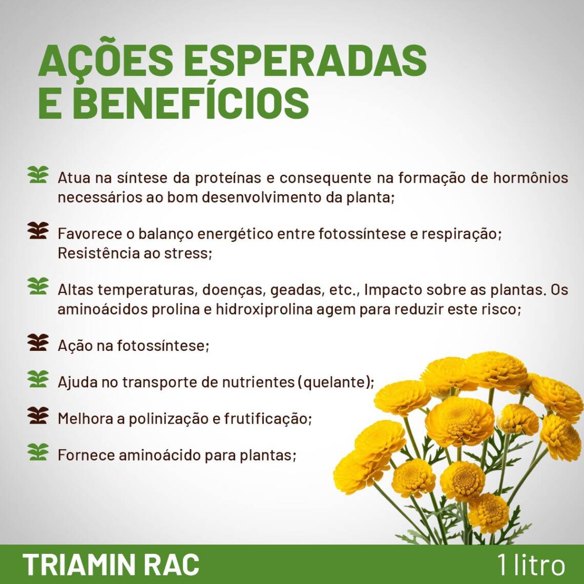 - Otimize cada etapa do crescimento das suas culturas com o Triamin RAC, uma solução completa que estimula a síntese de proteínas e aumenta a concentração de clorofila, resultando em plantas mais saudáveis e produtivas.